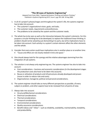The document outlines 30 laws of systems engineering that systems engineers should follow when developing complex projects. The laws emphasize taking a holistic, systemic view of projects that considers interactions between components, potential unintended consequences, and changes over time. Engineers are advised to integrate perspectives from different disciplines, manage risks and uncertainties proactively, and design with the full lifecycle and future changes in mind. The goal is to develop balanced, cost-effective solutions through collaborative teamwork.