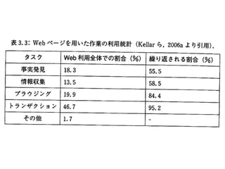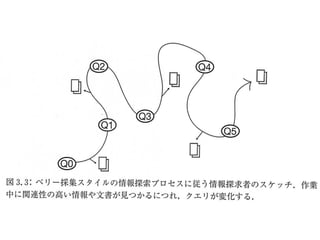 ユーザによる適合性評価 心理学的アプローチに よる情報行動の実験 (情報の選択的提供) 情報探索行動の分析 情報探索行動の分析 コンテキストにおける TRECスタイルの研究 TRECインタラクティブ フィルタリング、SDI トラックの研究 ログ解析 典型的な システムへの インタラクティブ情報検索 人間への フォーカス システムの研究 フォーカス 図1: 情報検索システムの研究アプローチの連続体 (Diane Kelly 「Methods for EvaluaHng InteracHve InformaHon Retrieval Systems with Users」 p.10 より引用