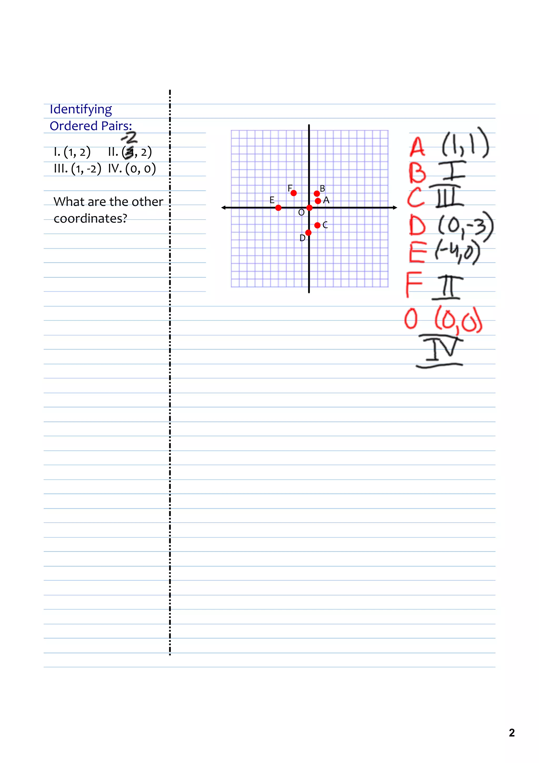 1. The document discusses coordinate planes and identifying points using ordered pairs. It provides examples of ordered pairs and asks the reader to identify other coordinates.