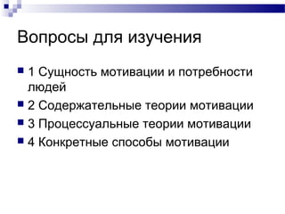 Документ рассматривает мотивационную политику организации, включая сущность мотивации, потребности людей и основные теории мотивации, такие как теория иерархии потребностей Маслоу и теория двух факторов Герцберга. Он также описывает ключевые понятия, такие как мотивы и стимулы, а также различные способы мотивации, как экономическими, так и неэкономическими. В заключение подчеркивается важность учета психологии и объективной оценки для повышения мотивации сотрудников.