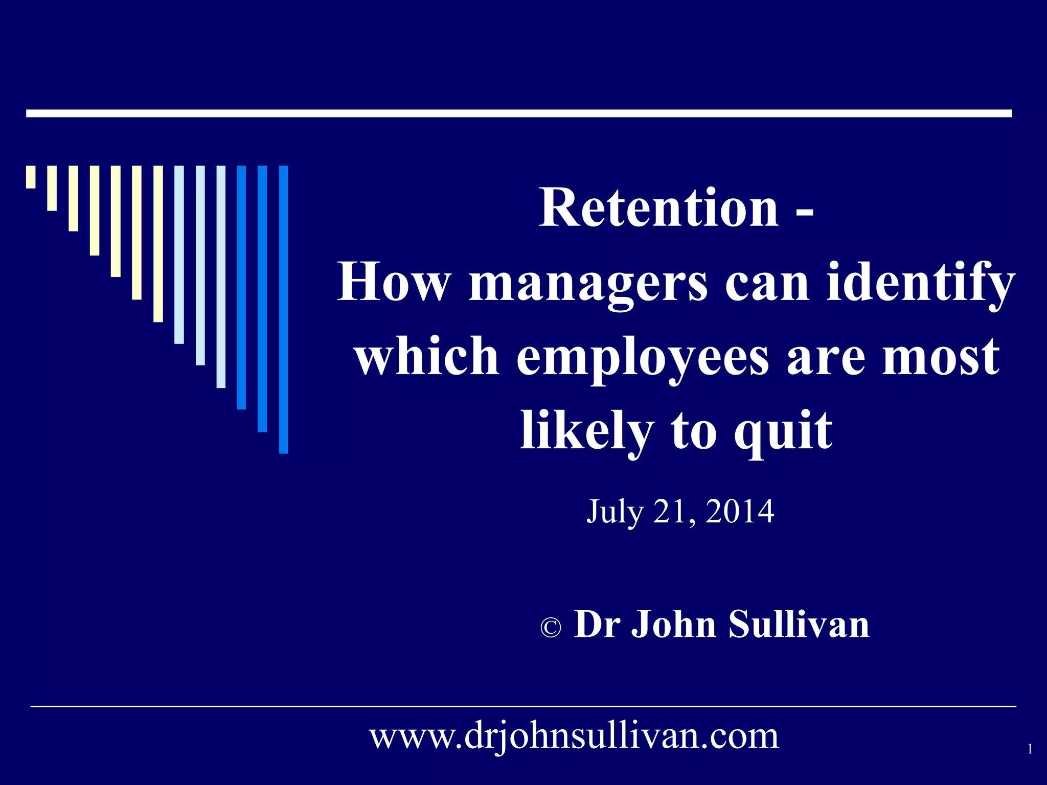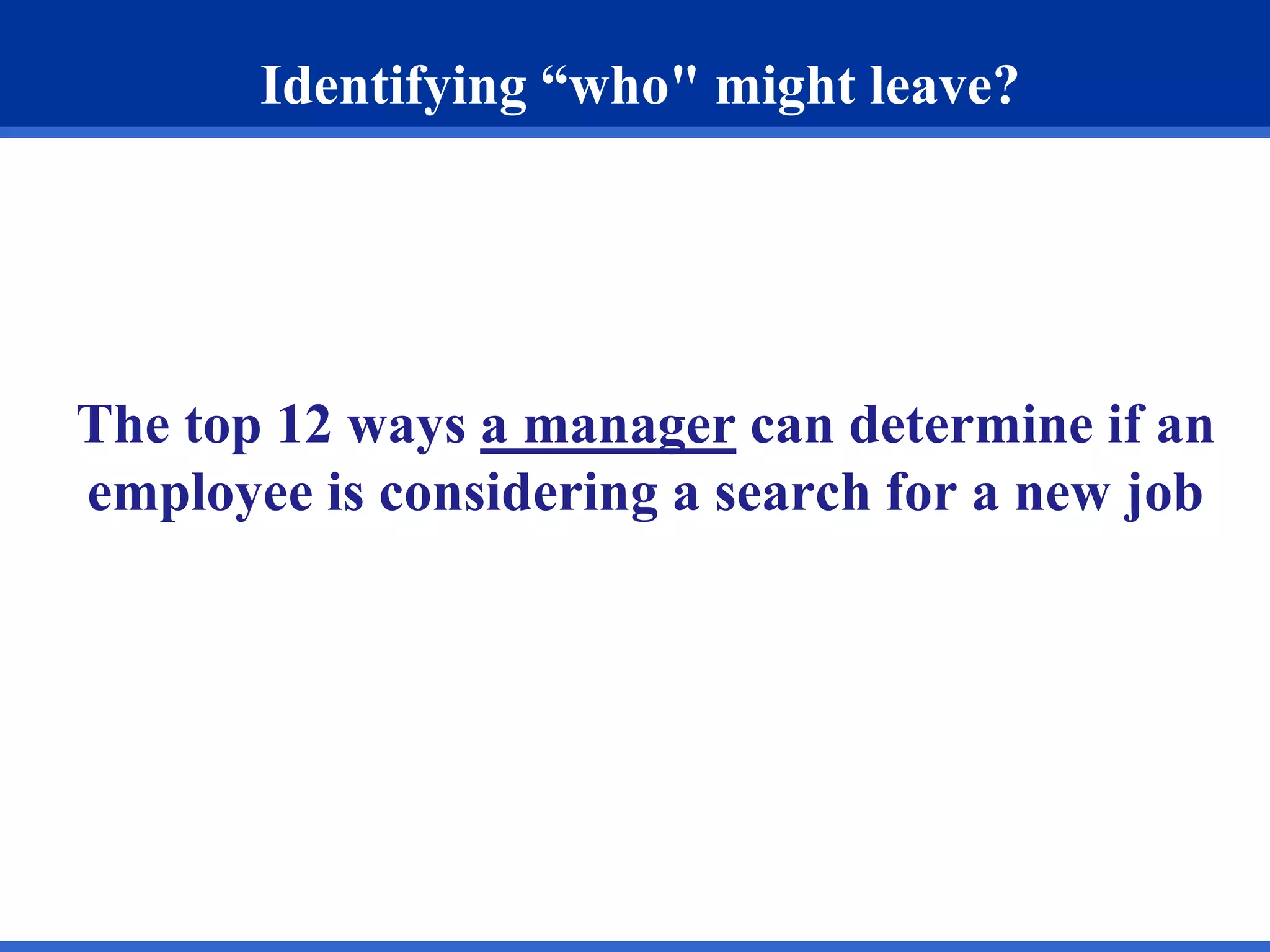 This document discusses ways for managers to identify employees who are most likely to quit. It provides 12 factors managers can look for to determine which employees may be considering leaving: conducting stay interviews; searching online profiles and job boards; examining past job tenure; identifying past reasons for quitting; targeting employees in high-turnover jobs; focusing on new hires; recognizing the impact when colleagues leave; looking for career-damaging events; recognizing ending career stages; watching for major life events; identifying those who feel overdue for advancement; and noticing when top performers feel underutilized. It also suggests additional external and internal approaches managers can use, such as monitoring behaviors and talking to well-informed colleagues.