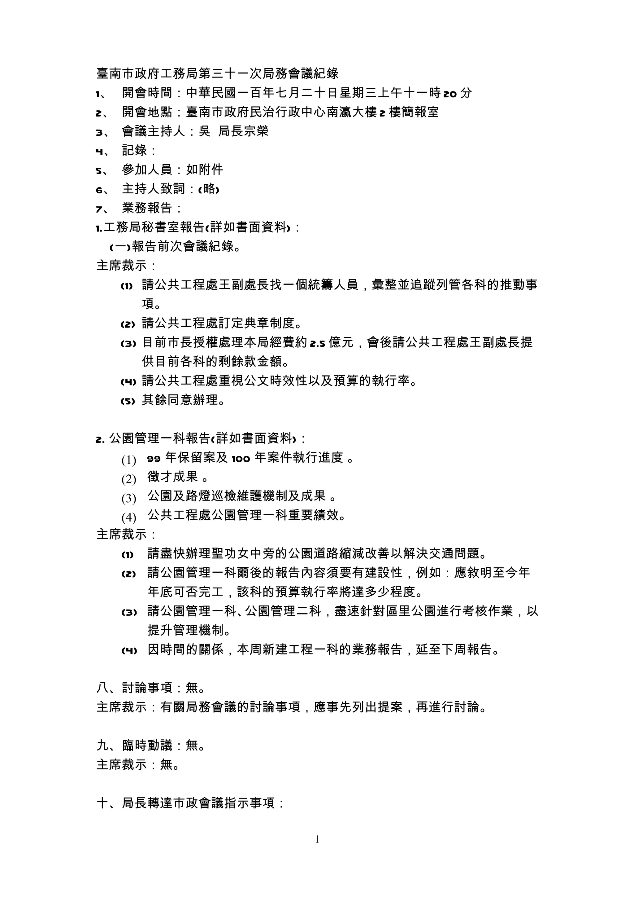 臺南市政府工務局於2021年7月20日召開第三十一次局務會議,討論工務相關業務及公園管理。會議中強調處理經費、公共工程執行及公園管理的改進,並轉達市政會議指示事項,包括局處人事異動及安全管理問題。最後,要求各科室迅速執行會議決議及落實公文時效。