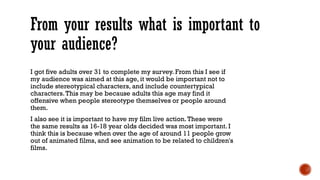 1) Adults over 31 would prefer films without stereotypical characters and include more countertypical characters, as stereotyping may be offensive to this age group. They also prefer live action films over animation like younger audiences.
