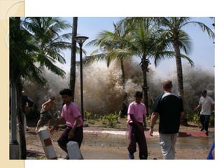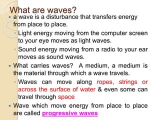 Waves are disturbances that transfer energy through a medium from one point to another. They can be transverse waves, where the disturbance is perpendicular to the direction of travel, or longitudinal waves, where the disturbance is parallel. Waves have properties like wavelength, amplitude, frequency, and speed. The speed of a wave depends on its frequency and wavelength and can be calculated using the formula that the speed equals the frequency multiplied by the wavelength. Waves undergo behaviors like reflection, refraction, and diffraction as they interact with barriers and changes in their medium.