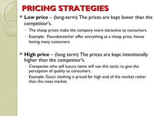 This document discusses various pricing strategies that companies use in marketing. It outlines strategies such as low pricing to attract customers, high pricing for luxury goods, promotional pricing for limited time deals, cost-plus pricing to cover costs and make a profit, and psychological pricing slightly below a round number to seem lower. Other strategies covered are loss leaders where one product is priced very low to attract customers to the store, penetration pricing to boost new product sales before raising price, and skimming to start with a high price for attention then gradually lower it.