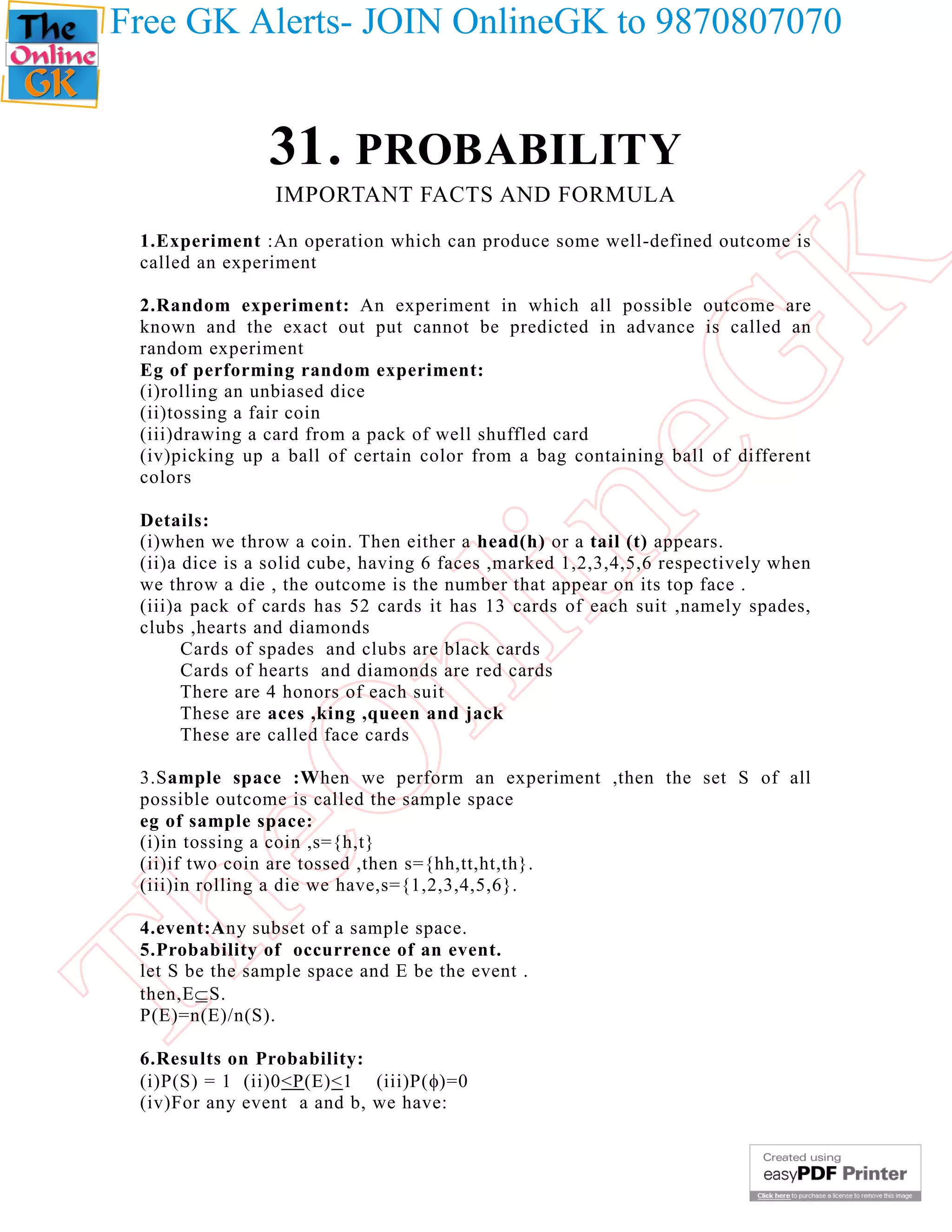 1. This document discusses probability and provides examples of calculating probability for random experiments and events.