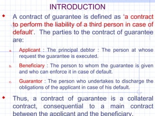 1) It defines a bank guarantee as a contract where the bank guarantees to perform a third party's liability in case of default. The parties involved are the applicant, beneficiary, and guarantor bank.