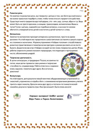 Документ содержит информацию о подготовке детей к празднику Песах и обсуждает важность жертвоприношений в еврейской традиции. В частности, рассматриваются темы, связанные с жертвами, обучение новым словам на иврите, развитие речи, математика и творческая деятельность, связанная с праздником. Также упоминаются занятия физкультурой и игры, которые развивают умения детей.