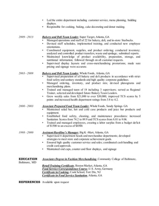 Brian Butler has over 10 years of experience in food service management, including roles as bakery and deli manager. He has a strong track record of improving operations through training, customer service, and sanitation. His experience spans multiple retailers and includes increasing sales, scores, and managing large teams.