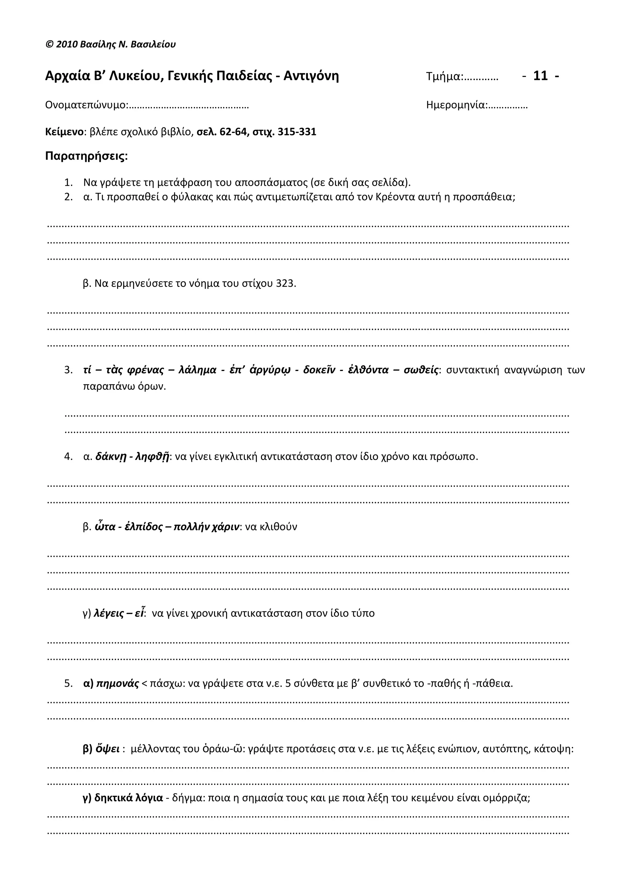 Ν. Βαςιλείου Αρχαία Β’ Λυκείου, Γενικής Παιδείας - Αντιγόνη Τμιμα:………… - 11 - Ονοματεπϊνυμο:……………………………………… Ημερομθνία:…………… Κείμενο: βλζπε ςχολικό βιβλίο, σελ. 62-64, στιχ. 315-331 Παρατηρήσεις: 1. Να γράψετε τθ μετάφραςθ του αποςπάςματοσ (ςε δικι ςασ ςελίδα). 2. α. Τι προςπακεί ο φφλακασ και πϊσ αντιμετωπίηεται από τον Κρζοντα αυτι θ προςπάκεια; ................................................................................................................................................................................... ................................................................................................................................................................................... ................................................................................................................................................................................... β. Να ερμθνεφςετε το νόθμα του ςτίχου 323. ................................................................................................................................................................................... ................................................................................................................................................................................... ................................................................................................................................................................................... 3. τί – τὰσ φρζνασ – λάλημα - ἐπ’ ἀργφρῳ - δοκεῖν - ἐλθόντα – ςωθείσ: ςυντακτικι αναγνϊριςθ των παραπάνω όρων. ............................................................................................................................................................................. ............................................................................................................................................................................. 4. α. δάκνῃ - ληφθῇ: να γίνει εγκλιτικι αντικατάςταςθ ςτον ίδιο χρόνο και πρόςωπο. ................................................................................................................................................................................... ................................................................................................................................................................................... β. ὦτα - ἐλπίδοσ – πολλήν χάριν: να κλικοφν ................................................................................................................................................................................... ................................................................................................................................................................................... ................................................................................................................................................................................... γ) λζγεισ – εἶ: να γίνει χρονικι αντικατάςταςθ ςτον ίδιο τφπο ................................................................................................................................................................................... ................................................................................................................................................................................... 5. α) πημονάσ < πάςχω: να γράψετε ςτα ν.ε. 5 ςφνκετα με β’ ςυνκετικό το -πακισ ι -πάκεια. ................................................................................................................................................................................... ................................................................................................................................................................................... β) ὄψει : μζλλοντασ του ὁράω-ῶ: γράψτε προτάςεισ ςτα ν.ε. με τισ λζξεισ ενϊπιον, αυτόπτθσ, κάτοψθ: ................................................................................................................................................................................... ................................................................................................................................................................................... γ) δηκτικά λόγια - διγμα: ποια θ ςθμαςία τουσ και με ποια λζξθ του κειμζνου είναι ομόρριηα; ................................................................................................................................................................................... ...................................................................................................................................................................................