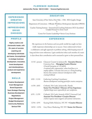 This document provides a profile for Florence Haridan, including her skills, education, and experience. She is a highly creative and charismatic leader with over 25 years of success coaching and developing individuals and teams. Her experience includes strategic business development, brand development, and interdisciplinary product and experience development. She currently serves as the Executive Director of Character Counts! in Jacksonville and the Managing Creative Director of Conscious Eats, a social enterprise.