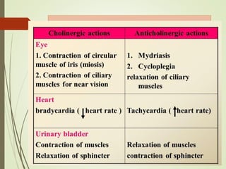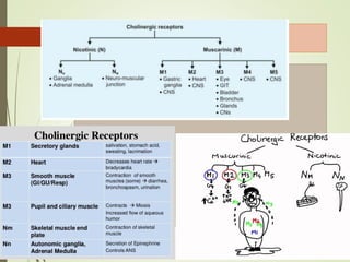 This document discusses anti-spasmodic drugs, which are smooth muscle relaxants used to prevent spasms in the gastrointestinal tract and urinary bladder. It describes two types - anticholinergics/antimuscarinics which block acetylcholine receptors, and non-anticholinergic smooth muscle relaxants. Specific drugs discussed include hyoscine butylbromide, dicyclomine, and drotaverine. These drugs are used to treat conditions involving smooth muscle spasms like irritable bowel syndrome, abdominal pain, and urinary incontinence. Their mechanisms of action and side effect profiles are also outlined.