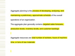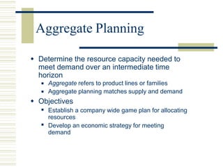 Aggregate planning is the process of developing, analyzing, and maintaining a preliminary schedule of overall operations over an intermediate time horizon. It matches the supply of resources to demand for products or services. The objectives are to establish a company-wide plan for allocating resources and develop an economic strategy to meet demand. Options for adjusting supply include varying workforce levels, overtime, inventory, and subcontracting. Options for managing demand include pricing, promotion, backordering, and creating new demand. Quantitative techniques can help evaluate strategies like level production, chasing demand, or mixed approaches.