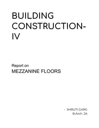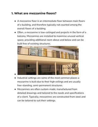 Mezzanine floors are intermediate floors installed between main floors to maximize unused vertical space. They provide additional floor area above and below without requiring additional columns. There are different types of mezzanine floors based on materials used - rack supported, steel structural, and concrete. National Building Code guidelines state that mezzanine area can be up to 25% of ground floor area and must have minimum height and size requirements. Common applications of mezzanine floors include industrial, warehouse, office, and retail spaces to improve storage capacity and maximize usable floor space.