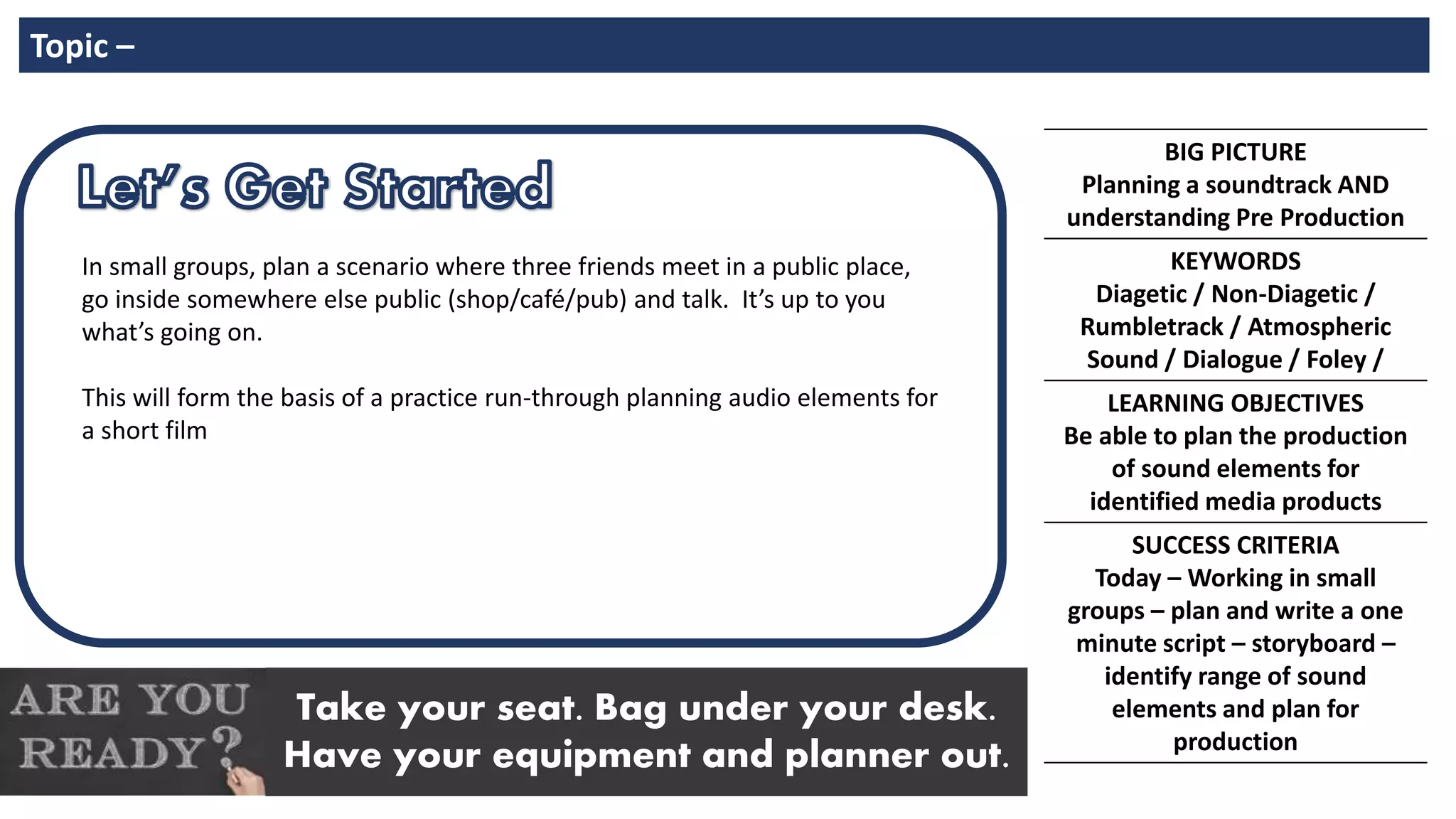 The document provides an overview of planning sound elements for a short film project. Students will work in small groups to plan a one-minute script involving three friends meeting in a public place and talking in another public location. They will identify and plan the production of different sound elements, such as dialogue, foley effects, and atmospheric sounds, to accompany their script. The lesson aims to help students learn how to plan soundtracks during pre-production.