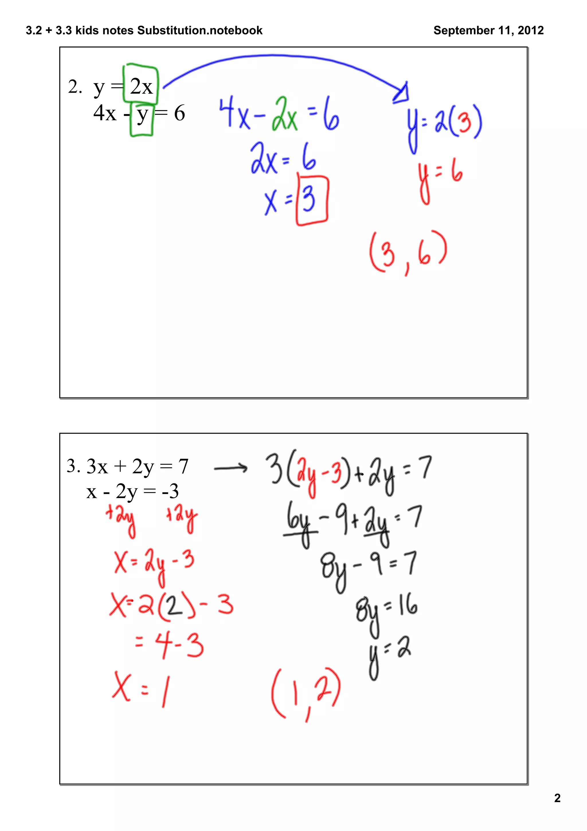 1. The document discusses solving systems of equations using substitution and elimination methods.