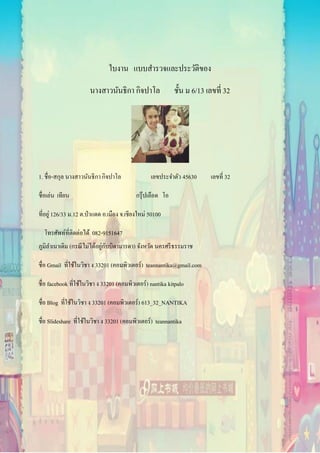 ชั้น ม 6/13 เลขที่ 32 1. ชื่อ-สกุล นางสาวนันธิกา กิจปาโล เลขประจาตัว 45630 เลขที่ 32 ชื่อเล่น เทียน กรุ๊ปเลือด โอ ที่อยู่ 126/33 ม.12 ต.ป่าแดด อ.เมือง จ.เชียงใหม่ 50100 โทรศัพท์ที่ติดต่อได้ 082-9151647 ภูมิลาเนาเดิม (กรณีไม่ได้อยู่กับบิดามารดา) จังหวัด นครศรีธรรมราช ชื่อ Gmail ที่ใช้ในวิชา ง 33201 (คอมพิวเตอร์) teannantika@gmail.com ชื่อ facebook ที่ใช้ในวิชา ง 33201 (คอมพิวเตอร์) nantika kitpalo ชื่อ Blog ที่ใช้ในวิชา ง 33201 (คอมพิวเตอร์) 613_32_NANTIKA ชื่อ Slideshare ที่ใช้ในวิชา ง 33201 (คอมพิวเตอร์) teannantika