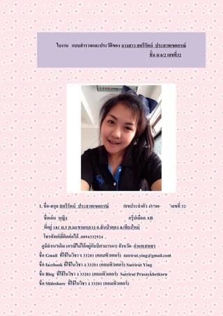 สตรีรัตน์ ประสาทเขตกรณ์ ชั้น ม 6/2 เลขที่32 1. ชื่อ-สกุล สตรีรัตน์ ประสาทเขตกรณ์ เลขประจาตัว 45700 เลขที่ 32 ชื่อเล่น หญิง กรุ๊ปเลือด AB ที่อยู่ 181 ม.5 ต.มะขามหลวง อ.สันป่ าตอง จ.เชียงใหม่ โทรศัพท์ที่ติดต่อได้ 0894332924 ภูมิลาเนาเดิม (กรณีไม่ได้อยู่กับบิดามารดา) จังหวัด กาแพงเพชร ชื่อ Gmail ที่ใช้ในวิชา ง 33201 (คอมพิวเตอร์) satrirut.ying@gmail.com ชื่อ facebook ที่ใช้ในวิชา ง 33201 (คอมพิวเตอร์) Satrirut Ying ชื่อ Blog ที่ใช้ในวิชา ง 33201 (คอมพิวเตอร์) Satrirut Prasaykhetkorn ชื่อ Slideshare ที่ใช้ในวิชา ง 33201 (คอมพิวเตอร์)
