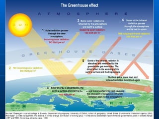 The document discusses various climate phenomena including how wind is caused by convection and affected by the Coriolis effect, how ocean currents regulate temperatures and precipitation, different climate zones defined by latitude, how elevation affects temperature, and the impacts of El Niño/La Niña and global warming through the greenhouse effect trapping heat.