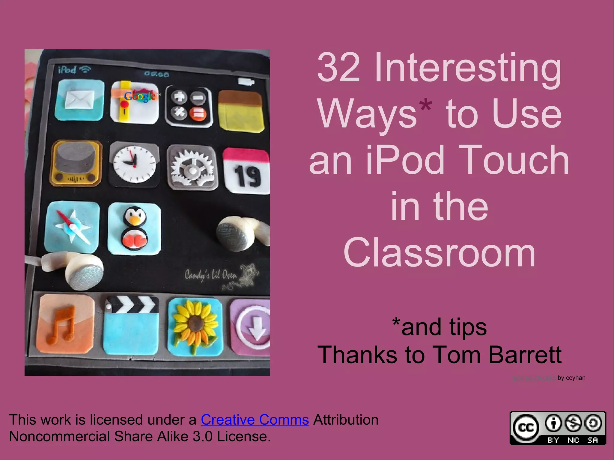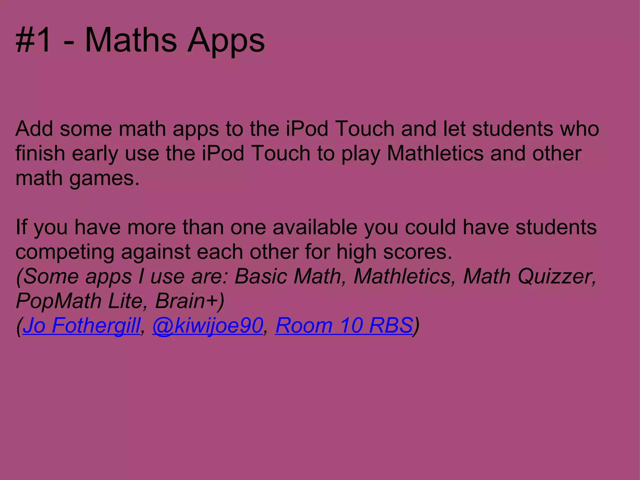 This document provides 26 tips for using an iPod Touch in the classroom, with each tip presented as its own numbered section. The tips cover a wide range of uses including math and language apps, collaborative storytelling, conducting assessments, creating flashcards, using mapping apps, and tracking weather data across locations. Many of the tips provide specific app recommendations and step-by-step instructions for activities. The overall document serves to inspire innovative ways to incorporate iPods into classroom lessons across subjects.