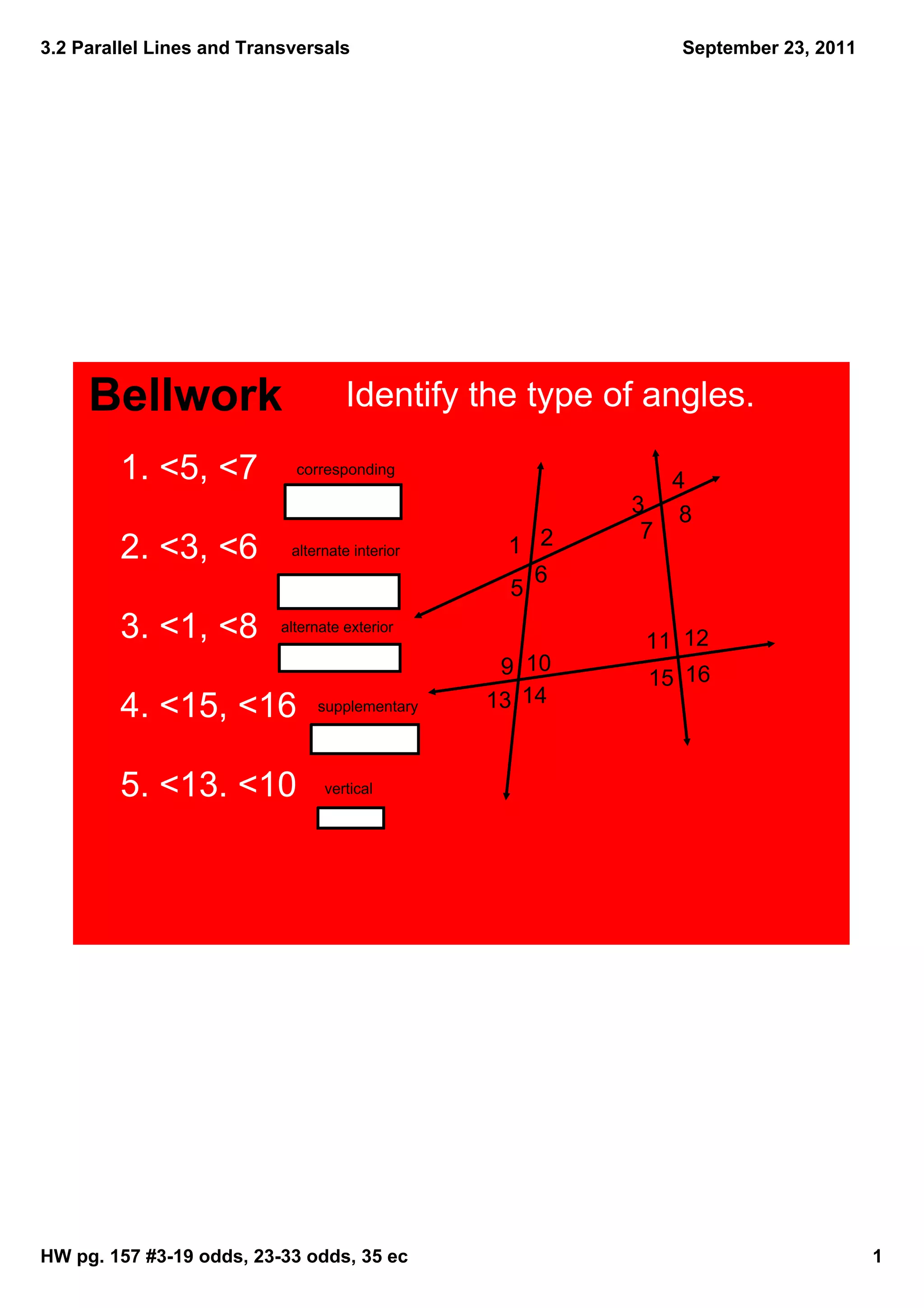 1) The document discusses parallel lines and transversals. It defines the corresponding angles postulate, the alternate interior angles theorem, and the alternate exterior angles theorem.