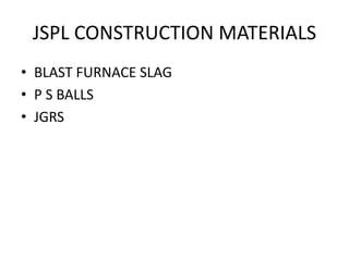This document provides information on blast furnace slag and Jindal Global Road Stabiliser (JGRS) produced by Jindal Steel & Power Ltd. It describes the production and properties of blast furnace slag, its various types and applications. It also provides details on JGRS, including its uses for road construction, advantages, test results, dosage recommendations, and example projects where it has been used successfully in India and abroad. Using JGRS for soil stabilization and road construction can provide benefits over conventional granular layer methods, such as reduced material and thickness requirements and improved durability.