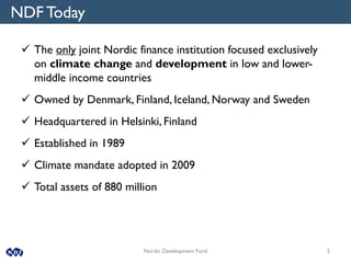 The Nordic Development Fund is owned by five Nordic countries and focuses exclusively on climate change and development projects in low and lower-middle income countries. It has total assets of 880 million and provides grant-based co-financing for 88 active climate finance projects totaling €244 million. Under its new 2016 strategy, the Fund will focus on catalyzing private sector investment, supporting climate innovation, and piloting high-risk climate interventions through grant and blended financing.