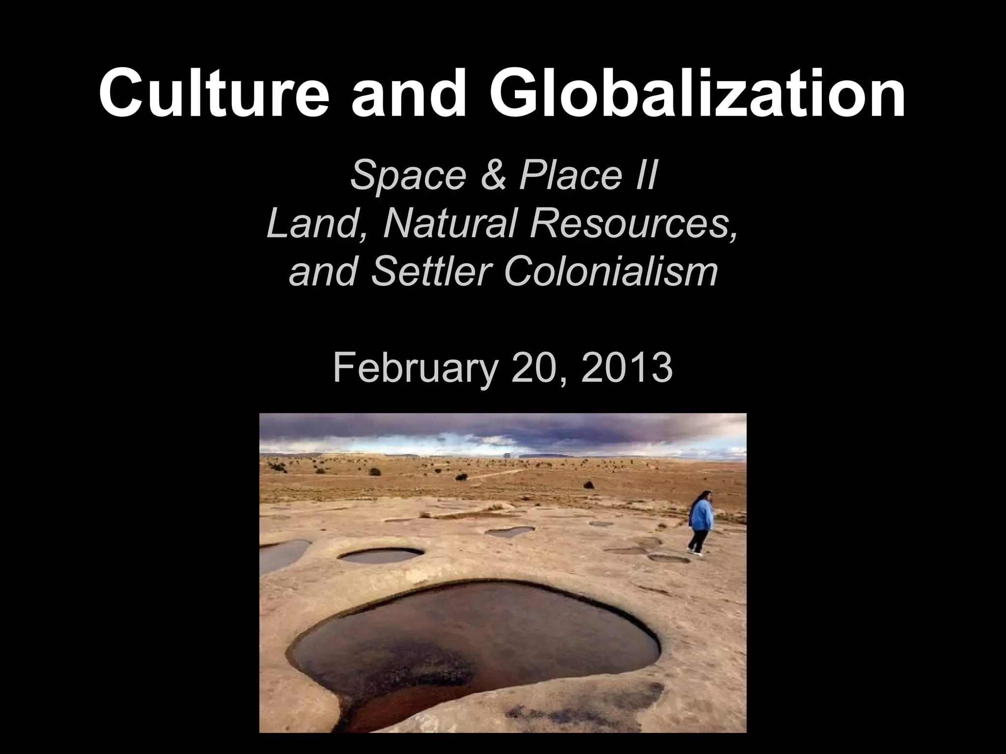This document discusses settler colonialism and its connection to globalization. It examines how settler colonialism involved claiming indigenous lands and natural resources. Articles by Goldstein and Waziyatawin explore how land struggles raise fundamental questions about U.S. settler colonialism and how environmental issues are inherently indigenous issues due to a history of colonial exploitation of resources. Uranium mining is presented as a case study showing how indigenous lands and health were negatively impacted by the globalization of resource extraction for military and industrial purposes.