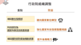 行政院组织调整包括成立数位发展部和国家科学及技术委员会,以提升国家科技发展和后备战力。新增组织涉及数字转型、通信基础设施以及国防后备动员等领域。此次调整提出16项新订或修正组织法案以强化整体规划与资源配置。