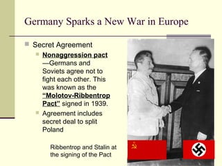 Germany invaded Poland in September 1939, starting World War 2 in Europe. Using their new blitzkrieg strategy of coordinated air and land attacks, Germany quickly conquered Poland, Denmark, Norway, the Netherlands, Belgium, Luxembourg, and France in 1940. Britain resisted a German invasion attempt. In North Africa, Italy invaded Egypt while Germany sent troops led by Rommel to aid Italy against the British. By April 1941, Germany had also conquered Yugoslavia and Greece to secure its southern flank before invading the Soviet Union. Though initially successful, the German invasion of the Soviet Union eventually stalled at Moscow and Leningrad. The US aided the Allies through the Lend-Lease program and the Atlantic Charter between Roosevelt and Churchill outlined democratic principles