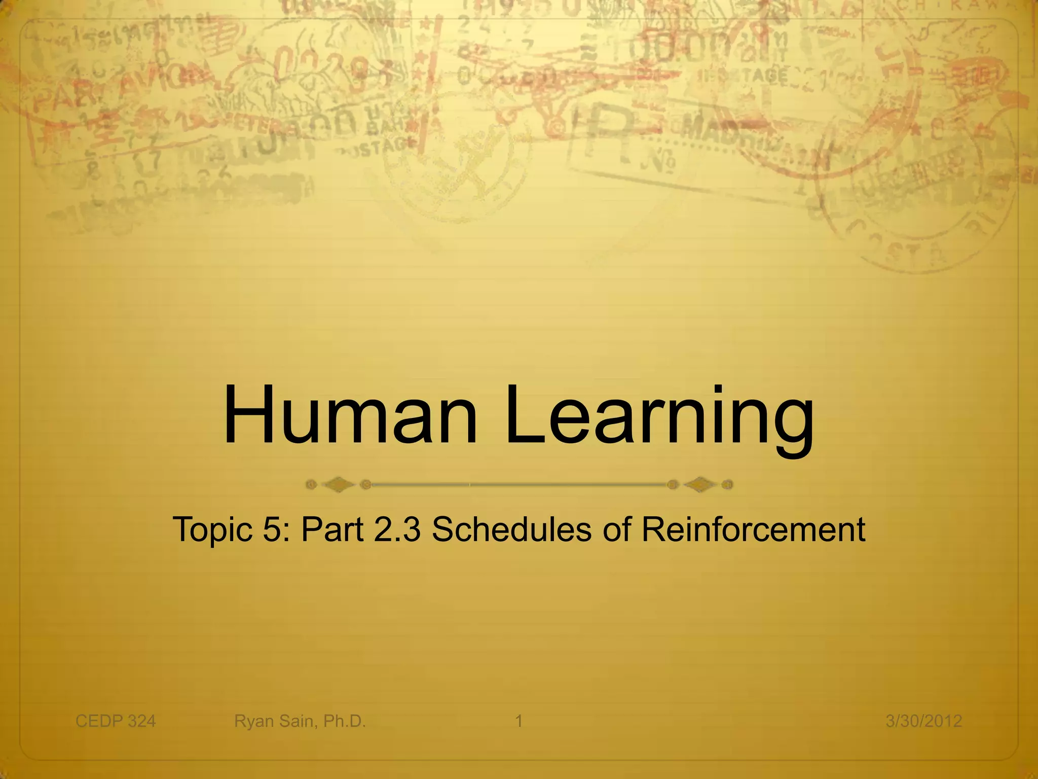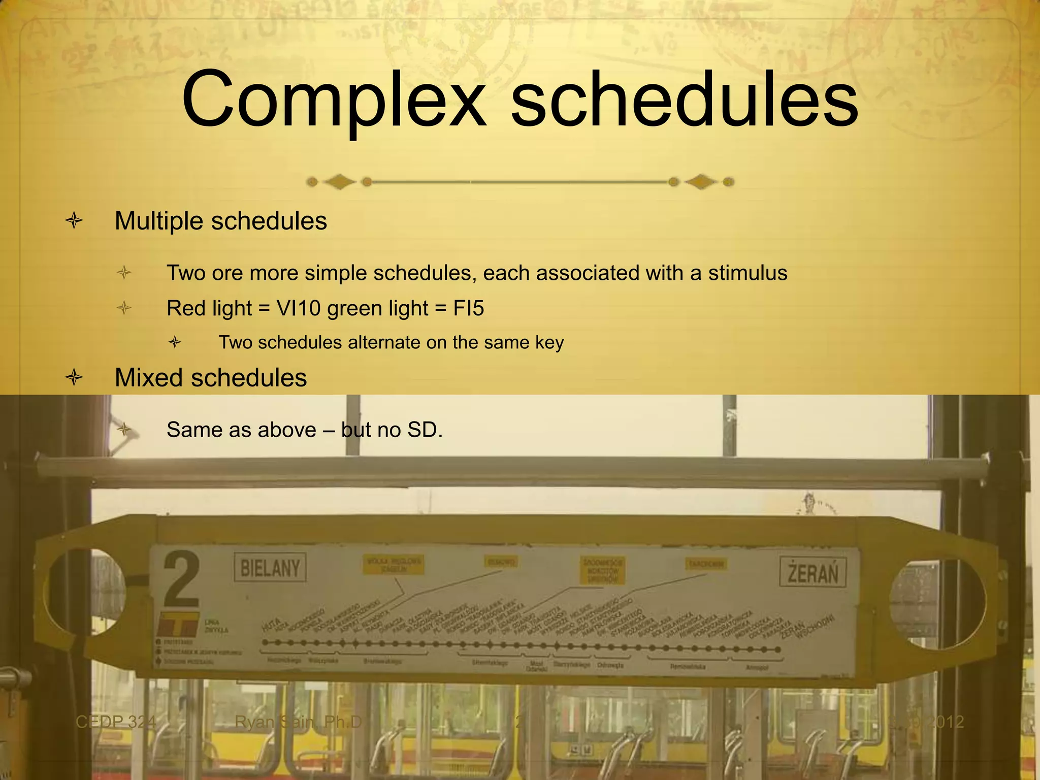 This document discusses different types of schedules of reinforcement used in human learning experiments, including multiple schedules, mixed schedules, chained schedules, concurrent schedules, and cooperative schedules. Multiple schedules alternate between two simple schedules signaled by different stimuli. Mixed schedules are similar but lack distinct stimuli. Chained schedules deliver reinforcement upon completion of a series of component schedules. Concurrent schedules make two or more schedules available simultaneously. Cooperative schedules require coordinated responses from two organisms to receive reinforcement.