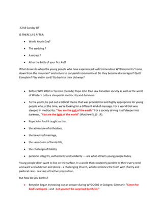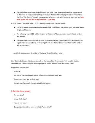 This document discusses life after spiritual experiences like World Youth Day and retreats. It notes that some people may become discouraged or return to old ways after such events. It then summarizes themes and messages from past World Youth Days, including encouraging youth to be salt and light in the world. Finally, it questions whether one's faith is alive after a retreat and asserts that there is life after death and something more.
