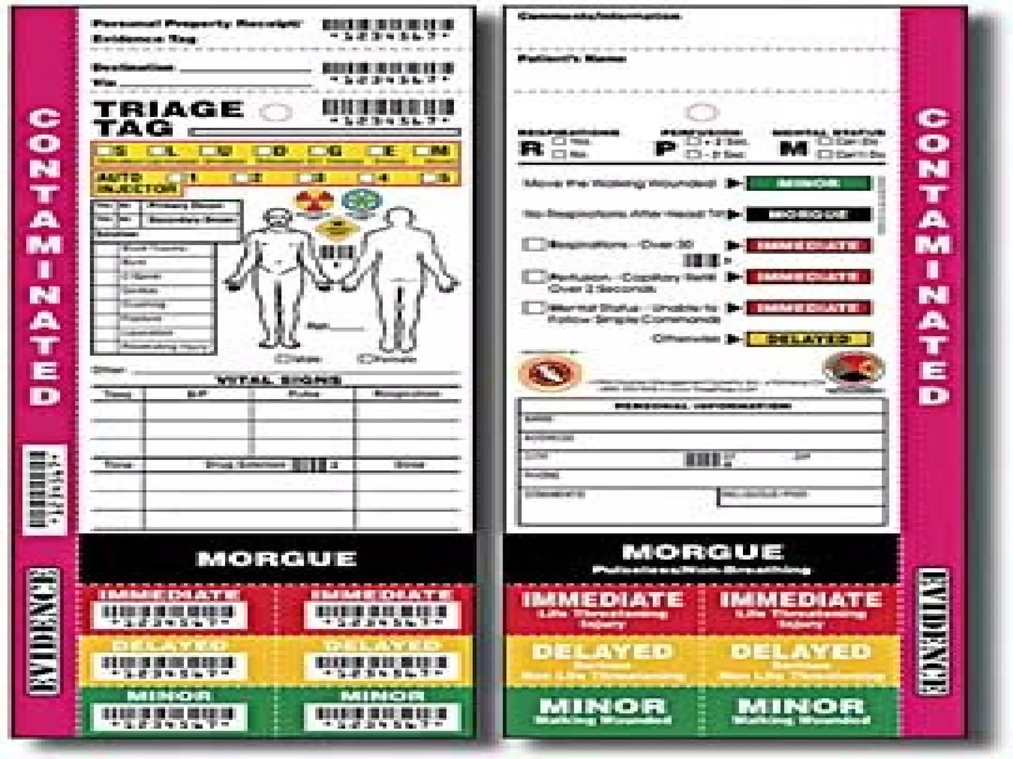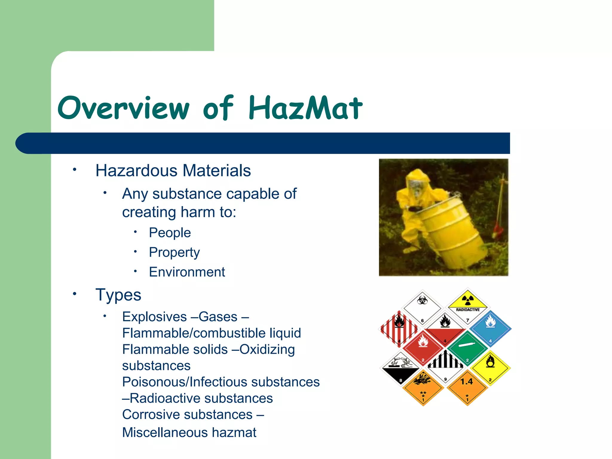 This document provides an overview of hazardous materials (HazMat) incidents and mass casualty incidents (MCI). It describes the types of HazMat, general safety procedures for approaching a HazMat scene, and establishing hazard zones. It also outlines the START triage method and categories for prioritizing patients (green, yellow, red, black). For MCIs, it discusses incident classification and management systems used to coordinate response. The document concludes with descriptions of initial responder roles and procedures for documenting and transporting patients from an MCI.