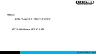 http://www.totolink.tw WD003 問題描述: 使用TOTOLINK分享器,要如何升級分享器呢? #TOTOLINK #Upgrade