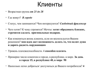 Документ содержит информацию о клиенте, представляющем собой свободного фрилансера в возрасте от 21 до 28 лет, который интересуется оригинальными подарками и созданием дизайна. Основные проблемы клиента включают нехватку финансовых ресурсов и трудности в поиске индивидуального подхода к каждому потребителю. Уровень боли и срочности проблемы оценивается на 3 из 5.