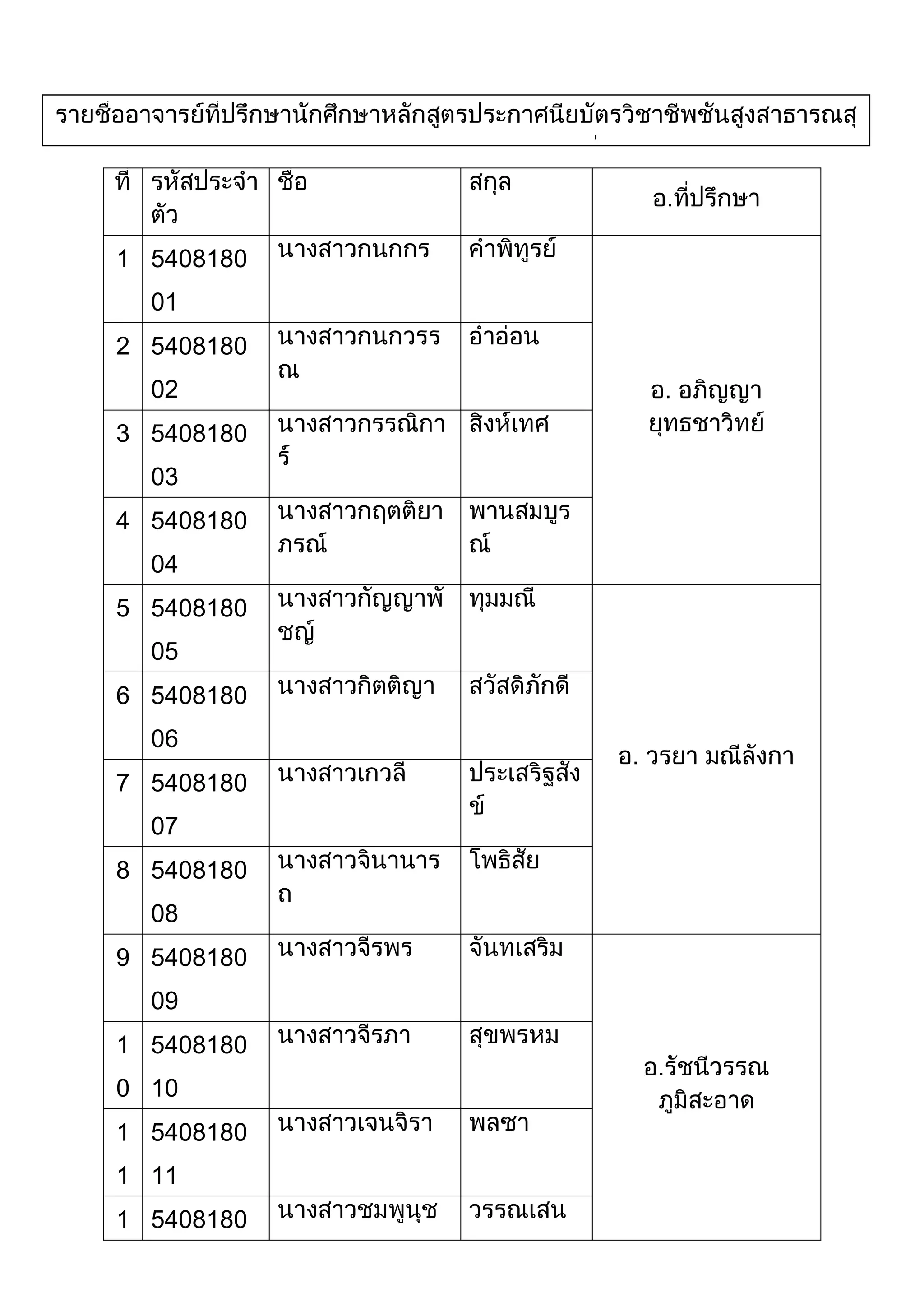 ที่รายชื่ออาจารย์ที่ปรึกษานักศึกษาหลักสูตรประกาศนียบัตรวิชาชีพชั้นสูงสาธารณสุขศาสตร์(ทันตสาธารณสุข) รุ่นที่ 33รหัสประจำตัวชื่อสกุลอ.ที่ปรึกษา1540818001นางสาวกนกกรคำพิทูรย์อ. อภิญญา ยุทธชาวิทย์2540818002นางสาวกนกวรรณอ่ำอ่อน3540818003นางสาวกรรณิการ์สิงห์เทศ4540818004นางสาวกฤตติยาภรณ์พานสมบูรณ์5540818005นางสาวกัญญาพัชญ์ทุมมณีอ. วรยา มณีลังกา6540818006นางสาวกิตติญาสวัสดิ์ภักดี7540818007นางสาวเกวลีประเสริฐสังข์8540818008นางสาวจินานารถโพธิ์สัย9540818009นางสาวจีรพรจันทเสริมอ.รัชนีวรรณ ภูมิสะอาด10540818010นางสาวจีรภาสุขพรหม11540818011นางสาวเจนจิราพลซา12540818012นางสาวชมพูนุชวรรณเสน13540818013นางสาวชวัลรักข์สิงห์โตขำอ.ภวัต โลเกศเสถียร14540818014นายชัยยุทธ์คุ้มวงษ์15540818015นางสาวชุติมาถานะพงษ์16540818016นางสาวณัฐชยาสุราราช17540818017นายณัฐดนัยสำราญบำรุงอ.รุ่งเพชร ยิ่งยงไพศาลกุล18540818018นายณัฐพงษ์ฉายหุ่น19540818019นางสาวณัฐรดีหว้านเครือ20540818020นายดนัยกรมเหลี่ยม21540818021นางสาวทิยาภาเมี้ยนมิตรอ. วงศ์วฤณ พิชัยลักษณ์22540818022นางสาวธรัญญาสิริวงษ์23540818023นางสาวธิดาทองเหลือง24540818024นางสาวธิดารัตน์ทิพโชติ25540818025นางสาวนัตฎาศรบาลโสง26540818026นางสาวนารีรัตน์การะเวกอ.วีรพงษ์ อนุสรณ์สิทธิ์27540818027นายปกรณ์กิจอ่อนแจ้ง28540818028นางสาวปรารถนาแสงดี29540818029นางสาวผจงจิตรดวงใจ30540818030นางสาวพรพิมลนาอ่อน31540818031นางสาวพรสุดาไกรตรีอ.ธัญลักษณ์ กัลยาสิริวัฒน์32540818032นางสาวภัทรนันท์สิมหนองมุม33540818033นายยุทธนาอ่อนศิลา34540818034นางสาวยุภาวดีภูษี35540818035นางสาวริชิตราดาทะราช36540818036นางสาวรุ่งนภาสมสวัสดิ์อ.เปรมฤดี ศรีสังข์37540818037นางสาววณิชยาทองมา38540818038นางสาววรากิตติ์เกชิต39540818039นางสาววัชรียาศรีจันแดง40540818040นางสาววาสนาบุญยืน41540818041นางสาววิชชุดาคำมาอ.โสรยา เฉลยจิต42540818042นางสาววิชชุตาสงวนพิมพ์43540818043นางสาวแววมณีแก้ววิเชียร44540818044นางสาวศศิธรอ่างคำ45540818045นางสาวศศิวิมลบุญมีทอง46540818046นางสาวศิริรัตน์ต้นสีนนท์อ. ปรียานุช นามพิกุล47540818047นางสาวศิริลักษณ์ดีหา48540818048นางสาวศิริวรรณไชยเดช49540818049นายสมบุญกระสุนรัมย์50540818050นางสาวสิริพรสิบกิ่ง51540818051นางสาวสุขุมาวงศ์คำจันทร์อ.จุฬนาริน กระพี้แดง52540818052นางสาวสุภาพรบุญมี53540818053นางสาวสุภาวิณีย์น้อยนิล54540818054นางสาวสุรัญญาวงศ์ชาลี55540818055นางสาวสุรีพรพละอาจ56540818056นางสาวโสภากิรัมย์อ.วรรณศรี แววงาม57540818057นางสาวหทัยชนกนาเจิมพลอย58540818058นางสาวอนุธิดาโสรัตน์59540818059นางสาวอนุศรามีเงิน60540818060นางสาวอรอนงค์ชมภูพื้น61540818061นางสาวอาริษาสุวรรณเวียงอ.จีรภา ประพาศพงษ์62540818062นางสาวอุทุมพรคำโทพล63540818063นางสาวพรนรินทร์อุดพ้วย64540818064นางสาวอาทิตรายอดเพชร65540818065นางสาวมัญชุภาเวงวิถา66540818066นางสาวรุ่งทิวาสารเงินอ.อรัญญา ศรีสุนาครัว67540818067นายสุทธ