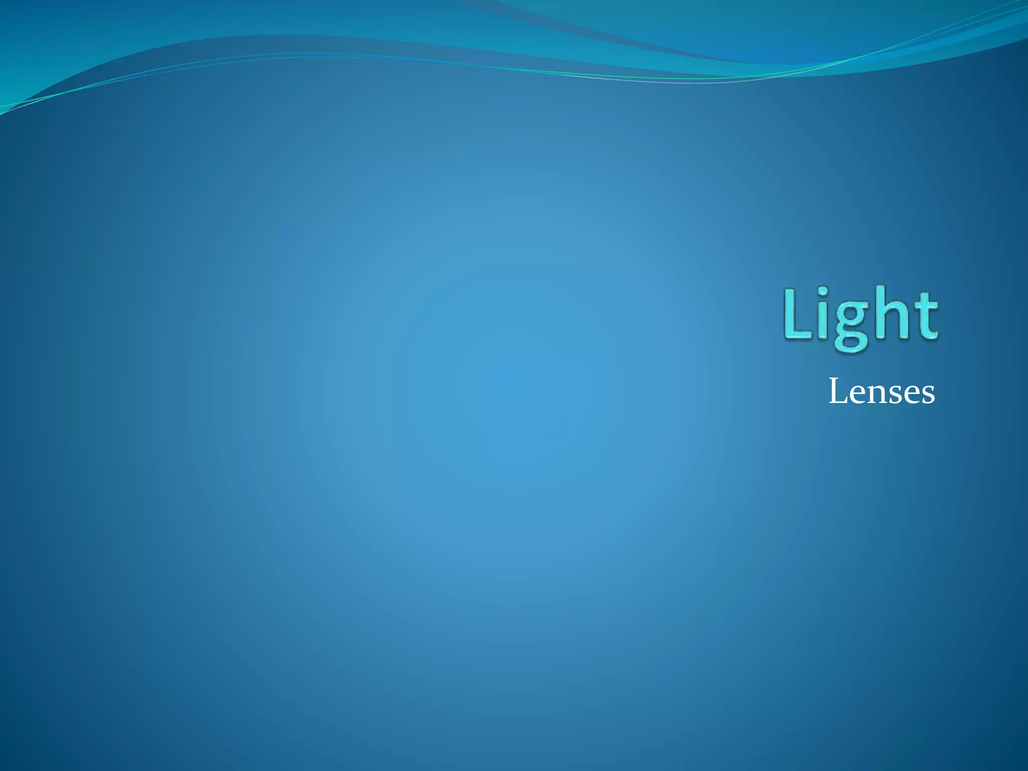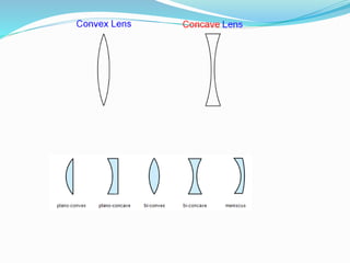 Lenses bend light to form images, either converging or diverging. Convex lenses are thick in the middle and thin at the edges, converging light, while concave lenses are thin in the middle and thick at the edges, diverging light. Ray diagrams illustrate the path of light through lenses using lines representing rays and key points like the optical center, principal axis, focal points, and images. Images can be magnified or diminished, inverted or upright, and real or virtual depending on their position relative to the lens and focal points. Magnification is calculated by comparing the size of the image to the object.