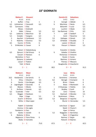 Il documento fornisce un'analisi delle prestazioni dei calciatori durante la 33° giornata di campionato, elencando i punteggi assegnati ai vari giocatori. Include formazioni tattiche, statistiche di rendimento e confronti tra diversi atleti. I punteggi variano da 1 a 14, evidenziando le prestazioni eccezionali di alcuni giocatori.