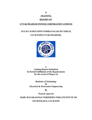 The document is a training report by Prateek Agarwal on the operations and systems of the 33/11 kV substation in Indiranagar, Lucknow, submitted for a Bachelor of Technology in Electrical & Electronics Engineering. It covers various components such as transformers, substations, circuit breakers, and power line communication systems, detailing specifications and functionalities of each. The training provided valuable insights into professional practices in the electrical power sector and was supported by multiple mentors and faculty members.