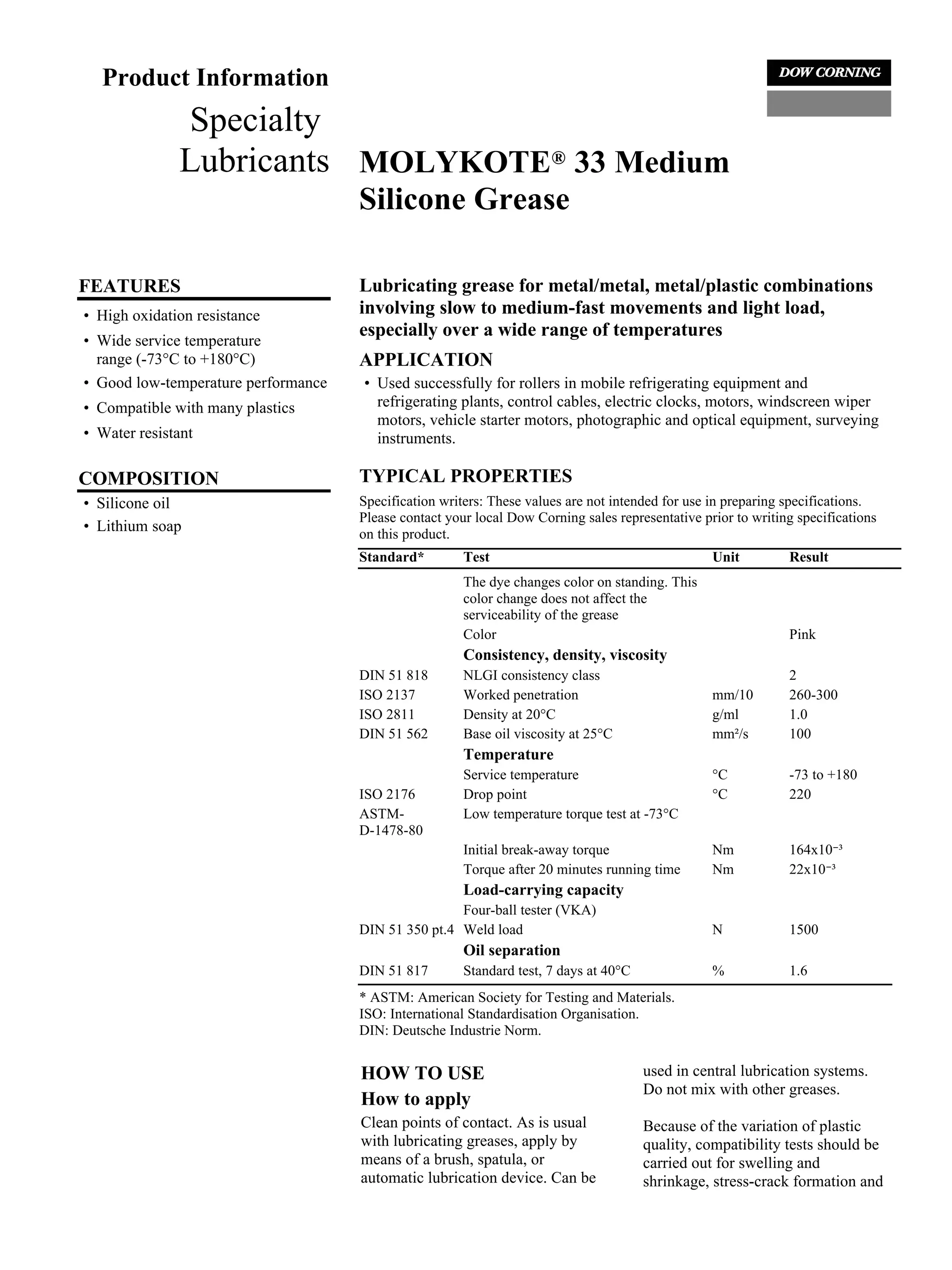 Molykote 33 is a pink, medium-firm silicone grease that provides lubrication for metal and plastic parts over a wide temperature range of -73°C to +180°C. It is suitable for use in slow to medium-fast moving parts and under light loads, such as rollers in refrigeration equipment, control cables, motors, and optical instruments. The grease has good oxidation resistance and water resistance. It consists of silicone oil and lithium soap and should be applied by brush or automatic lubricator. Compatibility testing is recommended when using with plastics due to varying material properties.