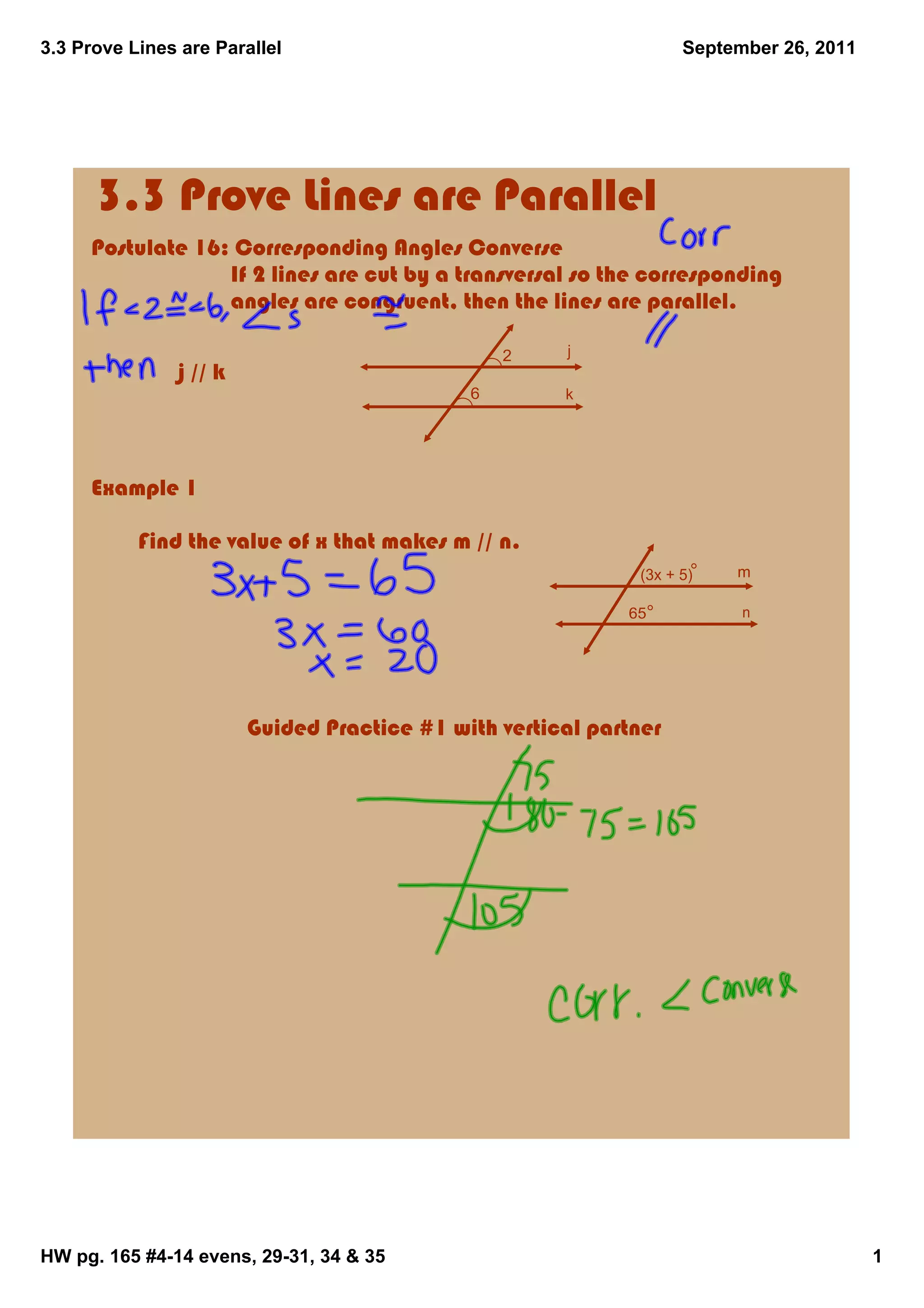 This document discusses six theorems for proving that two lines are parallel: (1) the corresponding angles converse theorem, (2) the alternate interior angles converse theorem, (3) the alternate exterior angles converse theorem, (4) the consecutive interior angles converse theorem, (5) using a paragraph proof, and (6) the transitive property of parallel lines theorem. It also assigns homework problems from page 165 involving using these theorems to prove lines are parallel.