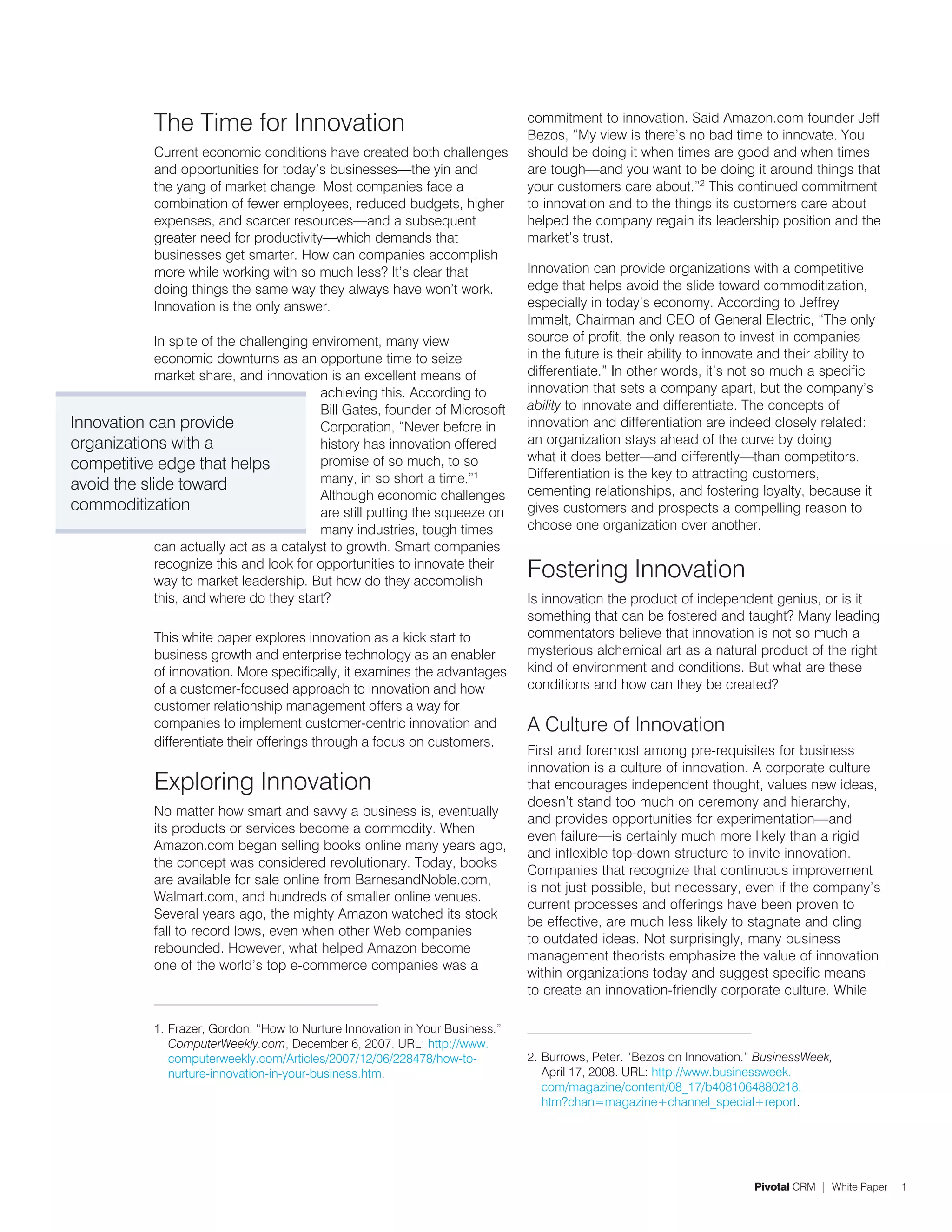 This white paper discusses the critical role of technology, specifically customer relationship management (CRM), in enabling customer-centric innovation within organizations. It emphasizes that fostering a culture of innovation and leveraging flexible CRM tools can significantly enhance customer experiences and internal efficiencies, ultimately providing a competitive advantage. The document highlights the importance of an agile, adaptable approach to technology and the need for businesses to continuously innovate to avoid commoditization, even in challenging economic conditions.