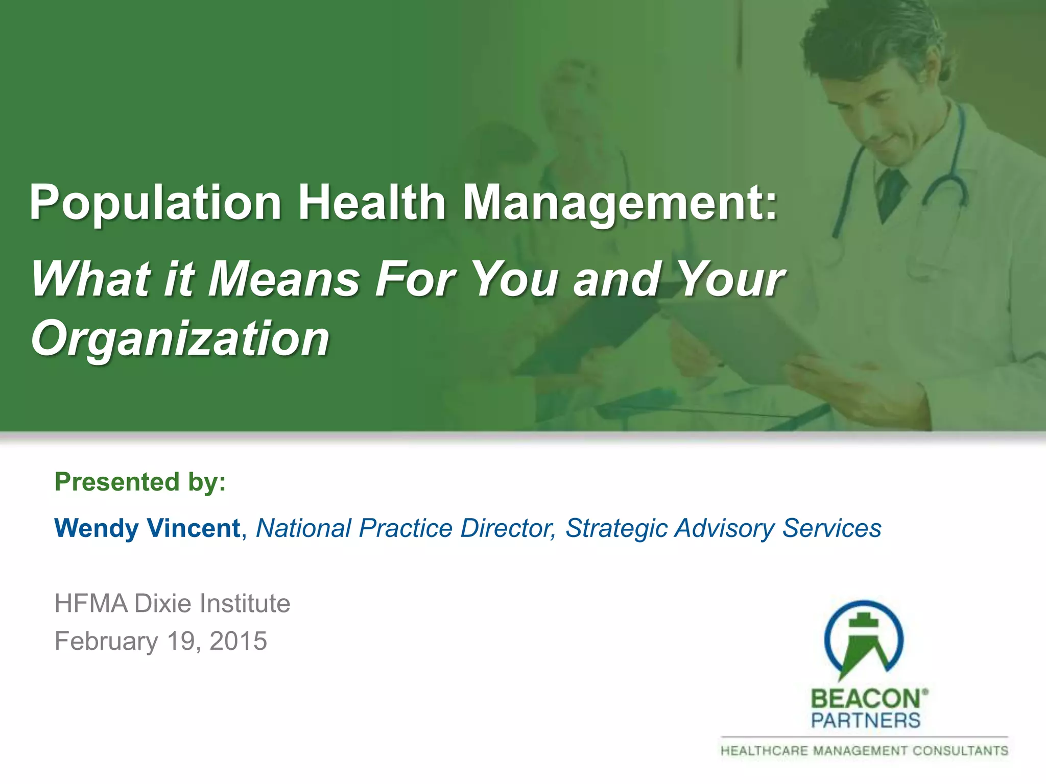 This document summarizes a presentation on population health management. It defines population health management as focusing on keeping patient populations as healthy as possible to reduce costly medical interventions. It identifies key aspects of population health management including defining targeted populations using data, establishing an effective governance structure, using technology to accomplish goals, and integrating care through community partnerships. The document provides examples of how organizations can implement population health management strategies.