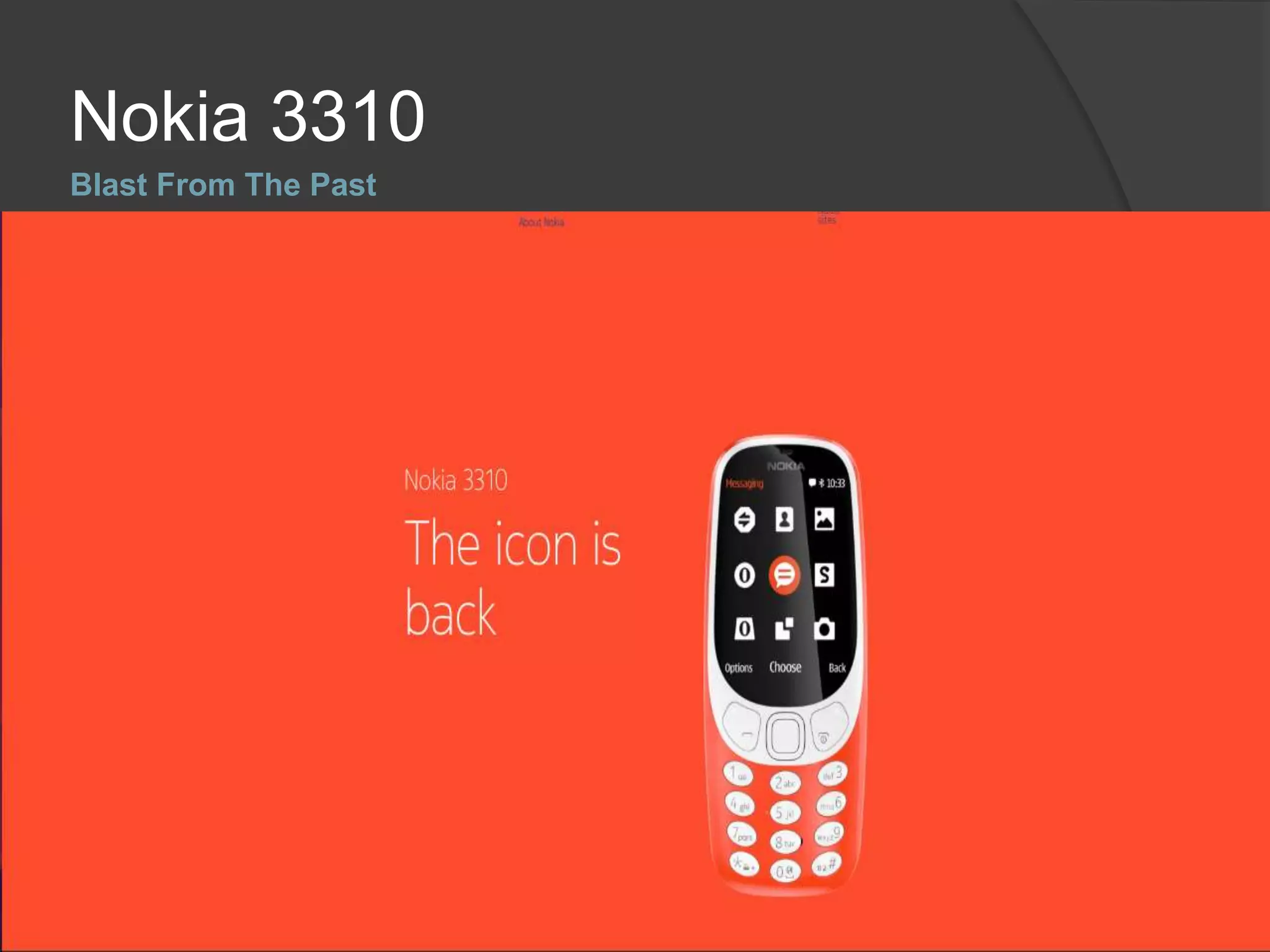 The document discusses the re-release of the Nokia 3310 in 2017 at MWC Barcelona. The original 3310 from 2000 was one of the best selling phones due to its indestructible design and long battery life. The new 3310 has updated features like a larger color screen, Bluetooth, SD card support, and Snake, while retaining the iconic design and long battery life of the original. However, it lacks modern connectivity features and its success in today's market will depend on whether customers still want a basic phone or expect more advanced technology.