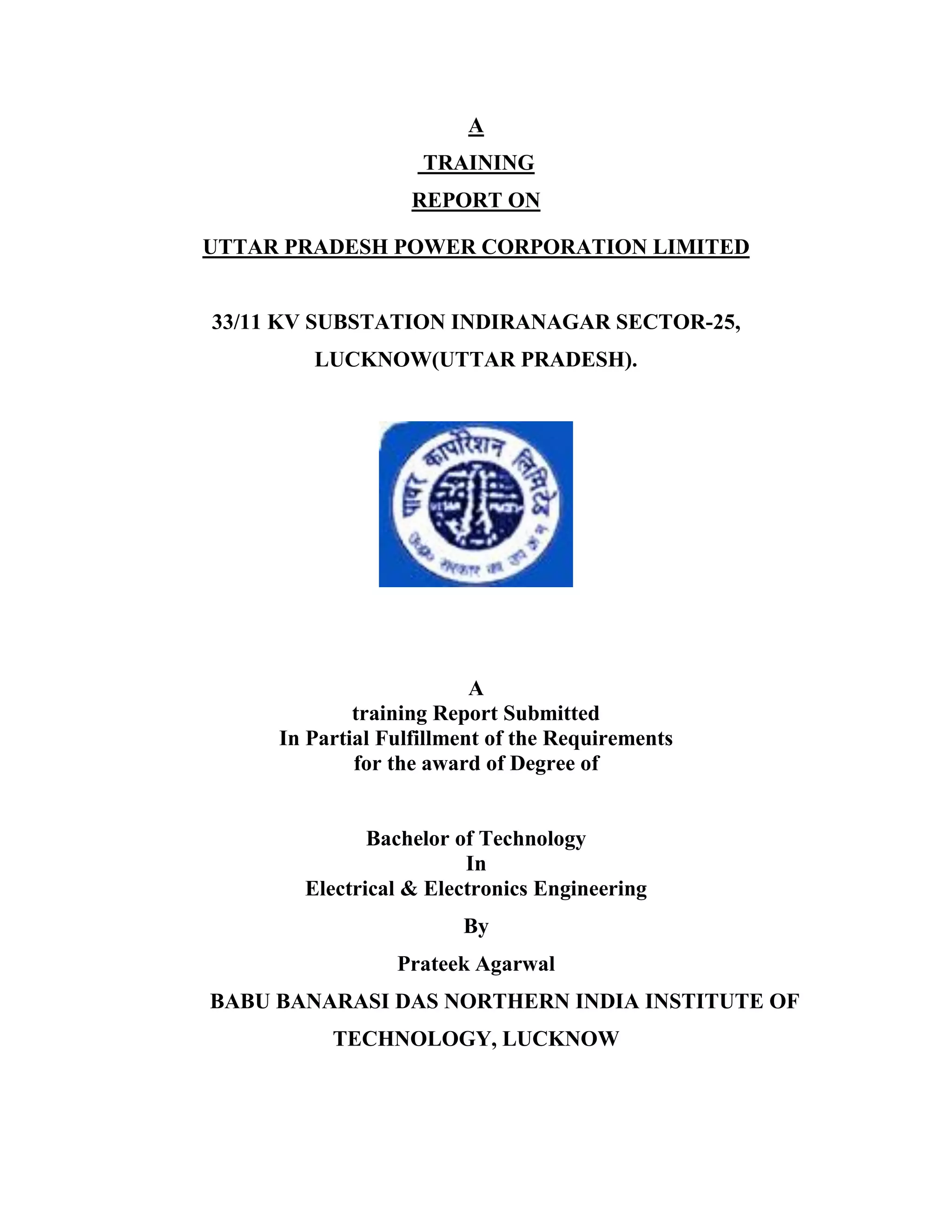 This document provides a training report on a 33/11 KV substation in Lucknow, India. It discusses various components of the substation including transformers, bus bars, insulators, circuit breakers, metering equipment, protection systems, and earthing methodology. The report provides specifications for components, describes the types and functions of substation equipment, and outlines the trainee's experiences during their training at the facility.