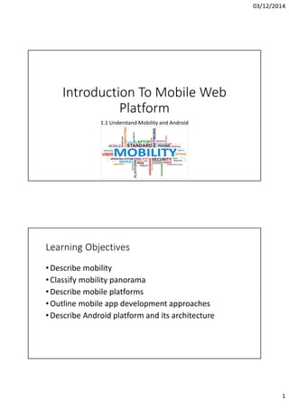 This document provides an introduction to mobile web platforms and mobility. It describes mobility as transforming the user experience from a desk to anytime, anywhere access. Mobility includes consumer uses like gaming, shopping and social media, as well as enterprise uses like retail offers, banking, and healthcare monitoring. The document outlines the logical landscape of consumer and enterprise mobility and the physical ecosystem of mobile components, middleware, and platforms. It describes the typical software stack of a mobile platform including the operating system, libraries, and application development frameworks. The document also compares different approaches to mobile app development, including native, hybrid, and web/HTML5.