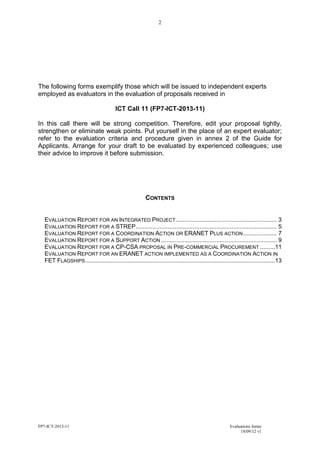 The document contains evaluation forms for proposals submitted to the ICT Call 11 (FP7-ICT-2013-11). There are evaluation report forms for different types of proposals including Integrated Projects, STREPs, Coordination Actions, Support Actions, CP-CSA proposals in Pre-Commercial Procurement, and ERANET actions implemented as Coordination Actions in FET Flagships. The forms include criteria for evaluation such as scientific and technological excellence, quality of implementation and management, and potential impact. Experts will use these forms to evaluate the proposals received for the call.