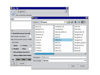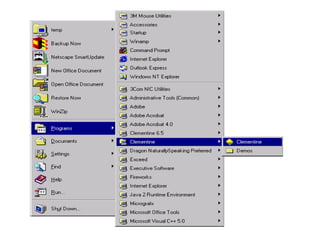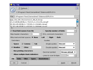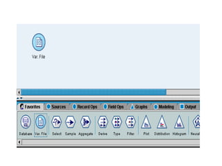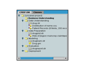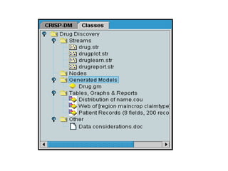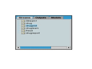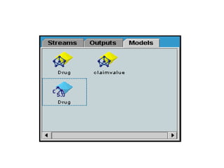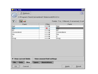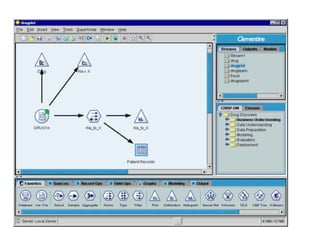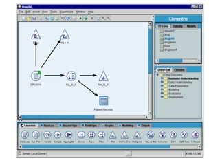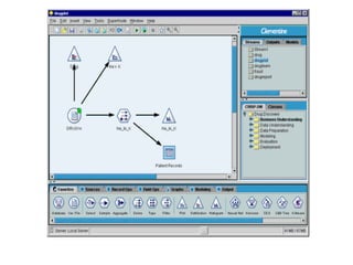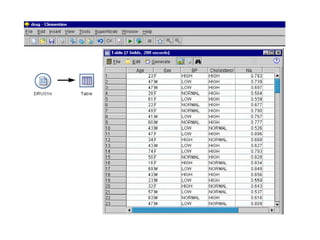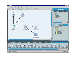 This tutorial introduces Clementine, a data mining toolkit. It provides an overview of the Clementine workspace and guides users through loading sample medical data, visualizing the data in a table, and preparing it for modeling. The goal is to help medical researchers find which drug may be appropriate for future patients with the same illness as those in the sample data.