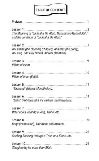 This document outlines 33 lessons for Muslims on various topics of Islamic faith and practice. It begins with an introduction by the compiler Abdul Aziz Saleh Al-Shomar, who explains that he expanded upon a previous work to provide more detailed explanations for non-Arabic speakers. The lessons then cover the meaning of the Islamic testimony of faith, the pillars of Islam and Iman, proper practices of worship like prayer and purification, and other issues related to monotheism and avoiding shirk (polytheism). The goal is to clearly communicate core Islamic teachings and address common misunderstandings.