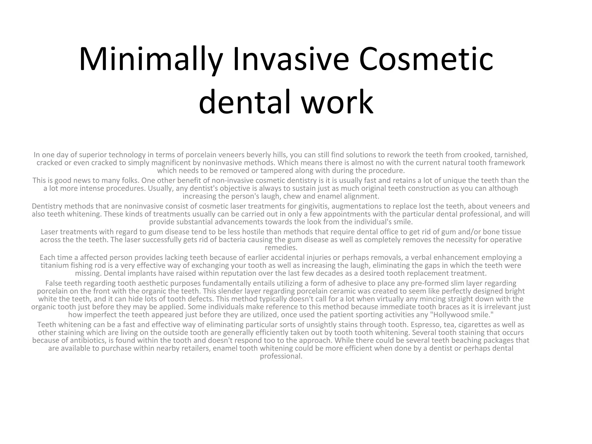Minimally invasive cosmetic dental procedures like porcelain veneers, dental implants, and teeth whitening can improve the appearance of teeth without extensive dental work. These procedures remove the need to remove significant amounts of healthy tooth structure and bone. They are also usually faster than more intensive procedures while still providing substantial improvements to a person's smile. Common minimally invasive procedures include veneers, implants to replace missing teeth, and laser treatments for gum disease which are less traumatic than methods requiring surgery.